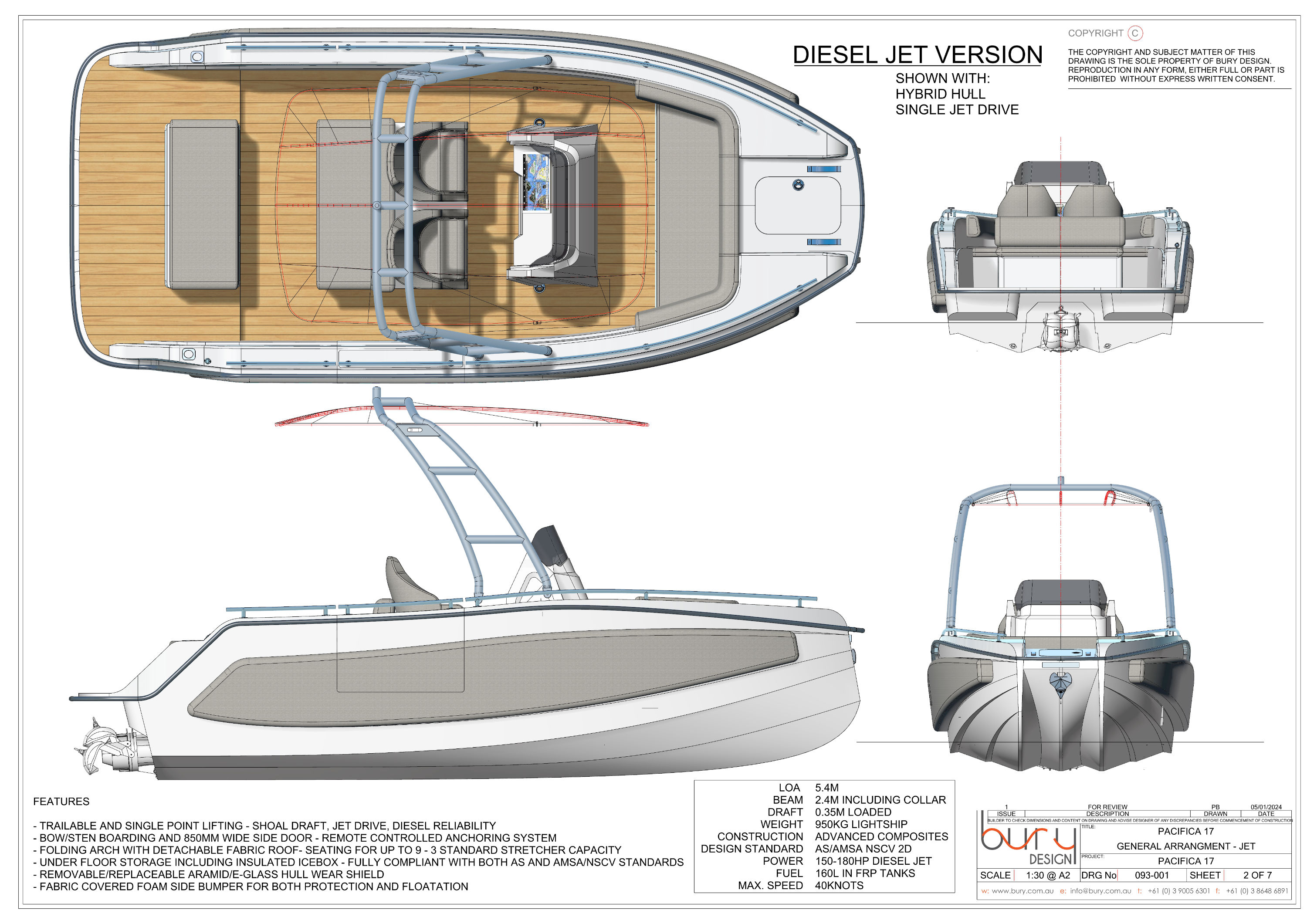The Pacifica 17 is an inboard water jet or outboard powered, modified catamaran hull form, superyacht tender, rescue, and sport boat. Standard inboard version comes with a 170Hp petrol 3-cylinder 4 stroke engine. Optional versions 230Hp petrol or 170Hp diesel. Standard outboard version comes with a 90Hp 4 stroke petrol engine with options up to 170Hp outboards. The Pacifica 17 provides excellent performance, topping out at more than 40 knots and cruising at 25.