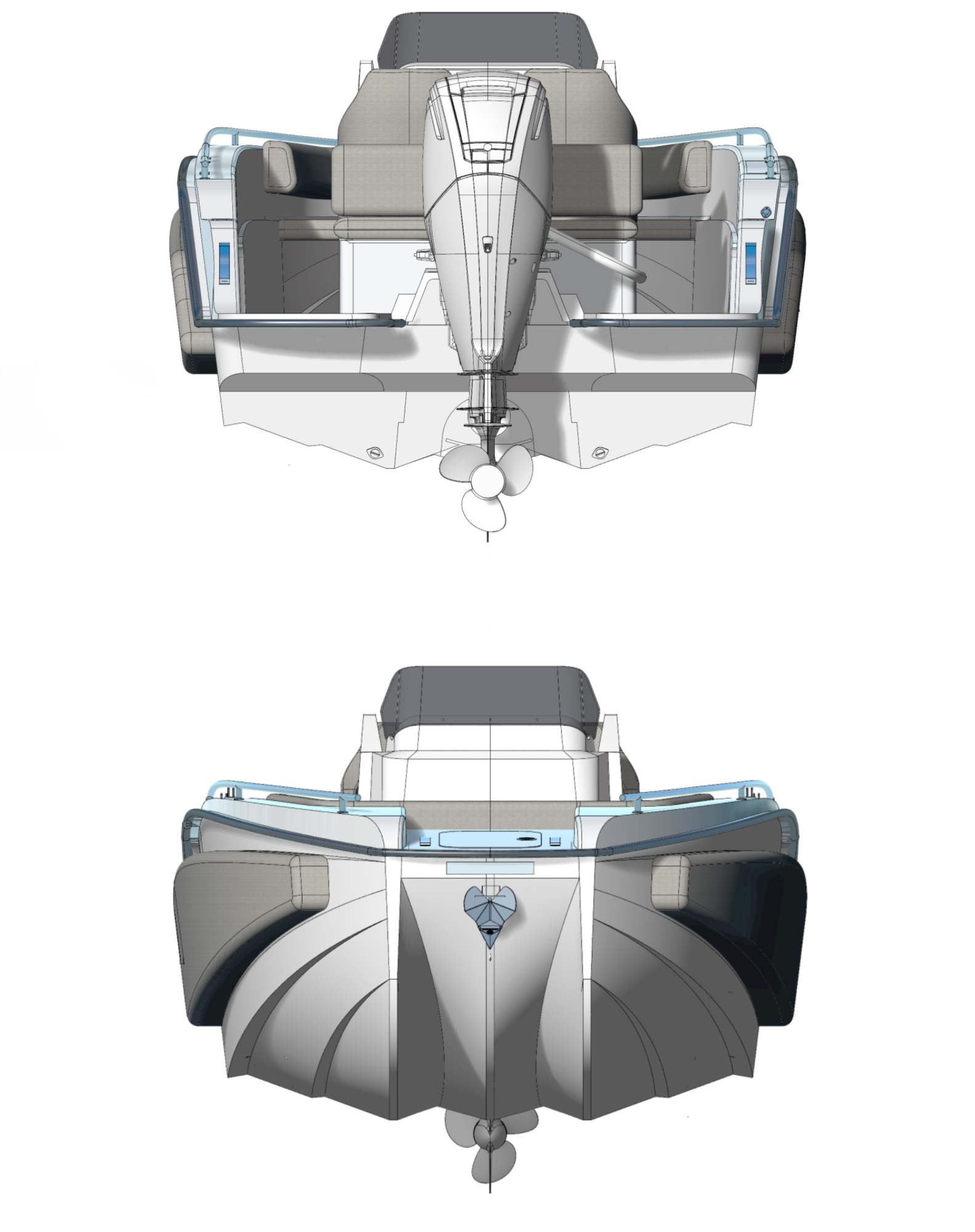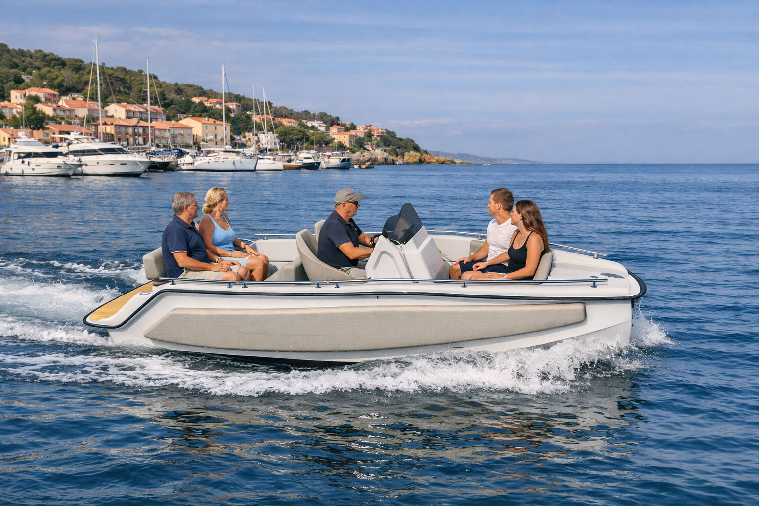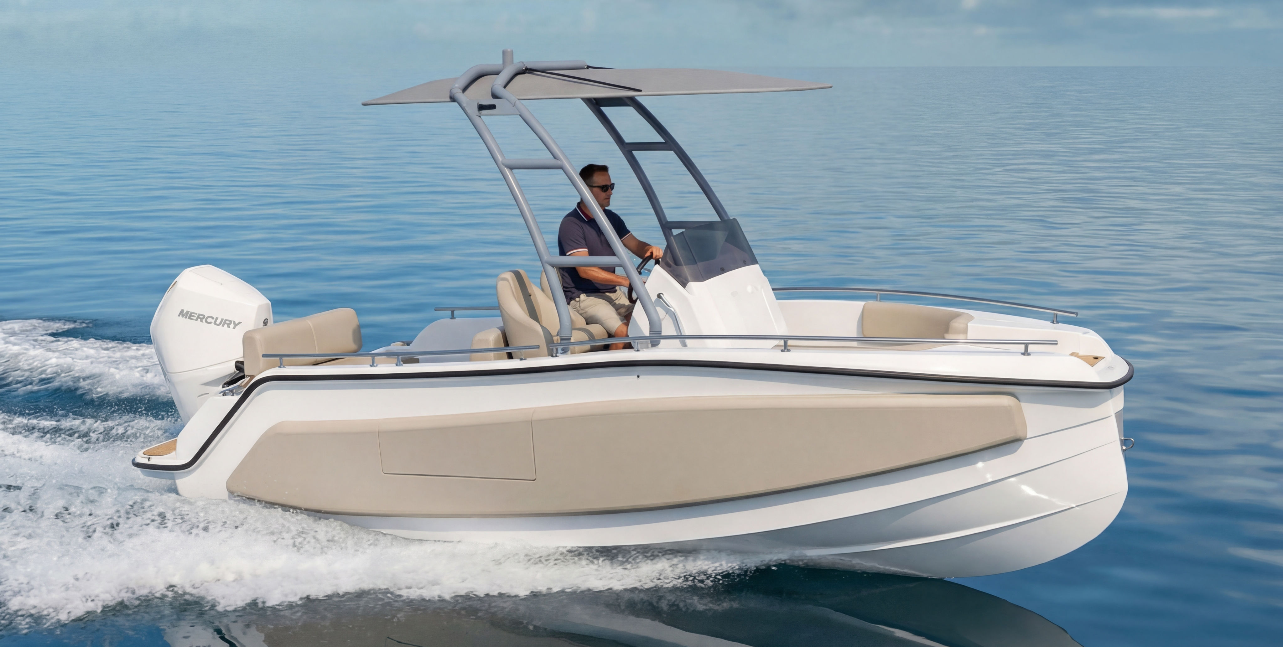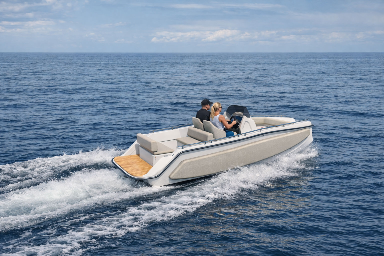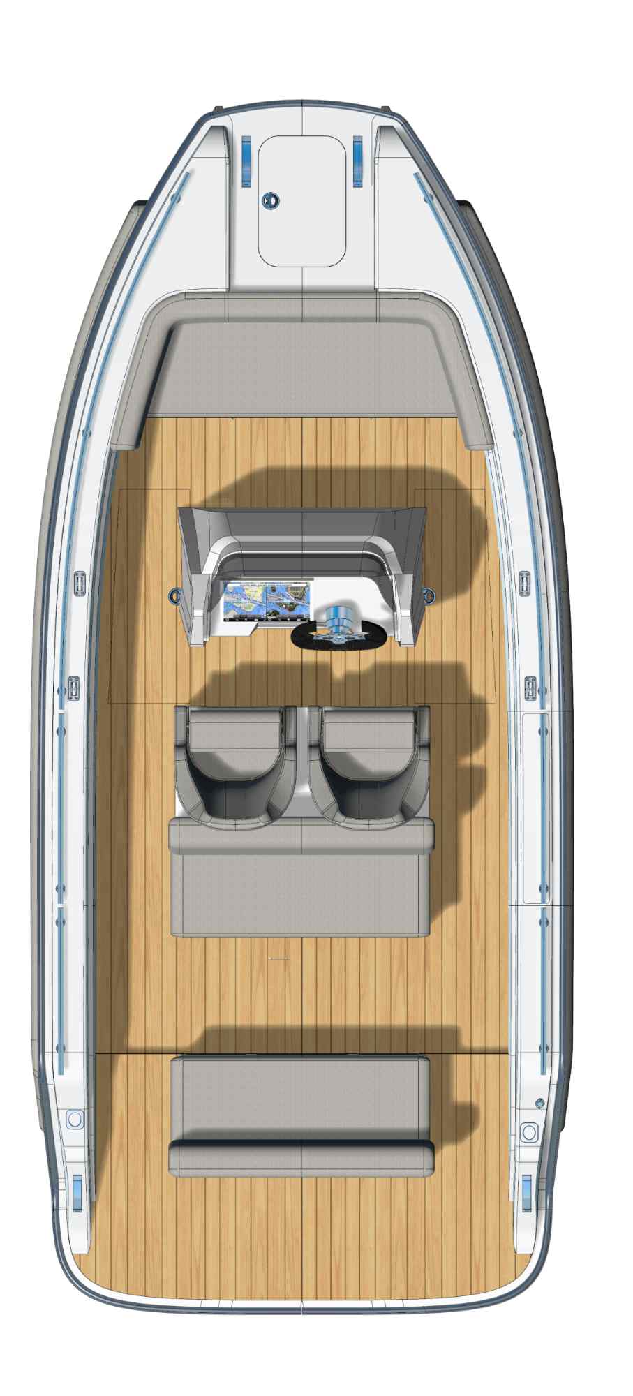 The innovative deck layout comes with twin bucket seats, centre console, bench seats for 4 in the stern and 2 more in the bow. Bow access is through a step up/down system and allows direct access to the beach. In the stern there is an expansive bathing/sun area with a drop down ladder for bathing. A large side door allows easy access for diving or side-to berthing.
